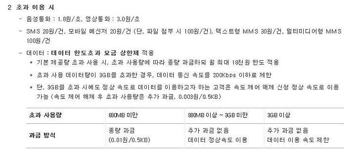 과금 : (음성무한 데이터 요금제 기준), 880MB 이전까지 18,000원 과금, 3GB초과시 18,000원 + 1MB당 6.144원 과금
